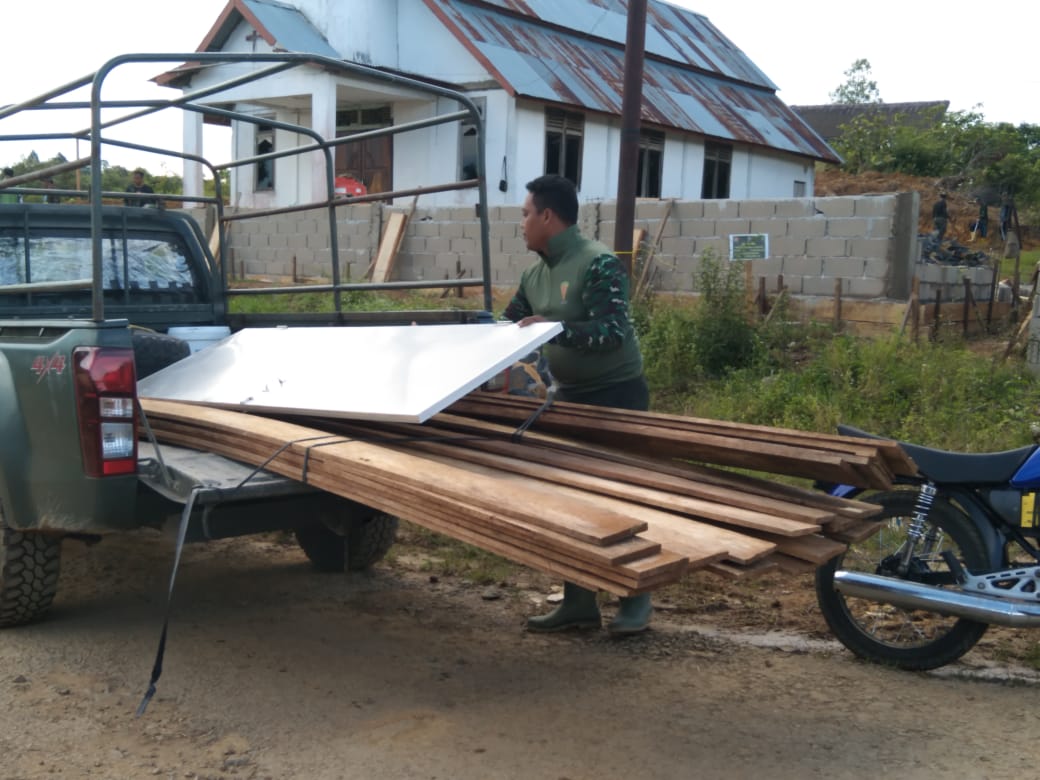 Pengerjaan puskesmas pembantu tersebut pada tahap ini tekah memasuki pemasangan pintu, Di sana nampak, Praka bayu yang menurunkan material pintu yang baru saja datang.