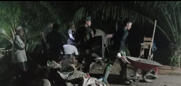 Malam yang gelap, udara yang dingin bukan sebagai penghalang untuk tekat dan niat satgas demi mewujudkan pengabdian TNI rerhadap rakyat. Ini dilihat mereka tetap semangat kerja keras sampai malam hari demi mengejar target.