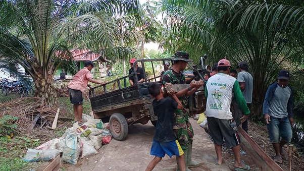 Kubu Raya – Pengerjaan jalan rabat beton di Desa Kuala Mandor B, Kecamatan Kuala Mandor B, Kabupaten Kubu Raya pada program TMMD ke-111 Kodim 1207/ Pontianak menggerakan personil dari unsur TNI, maupun warga sekitar. Kini satgas juga manfaatkan motor tosa untuk membantu percepat pengangkutan material di sasaran, Selasa (22/06/2021).