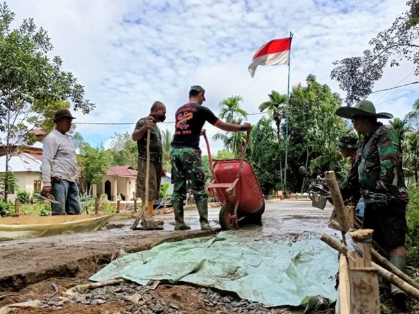 Tampak satgas TMMD dan warga masih semangat melakukan kegiatan pembangunan rabat beton jalan, yang dihiasi sang saka merah putih yang memberikan motivasi kepada warga dan khususnya kepada satgas yang mengemban tugas di lokasi TMMD ke-111.