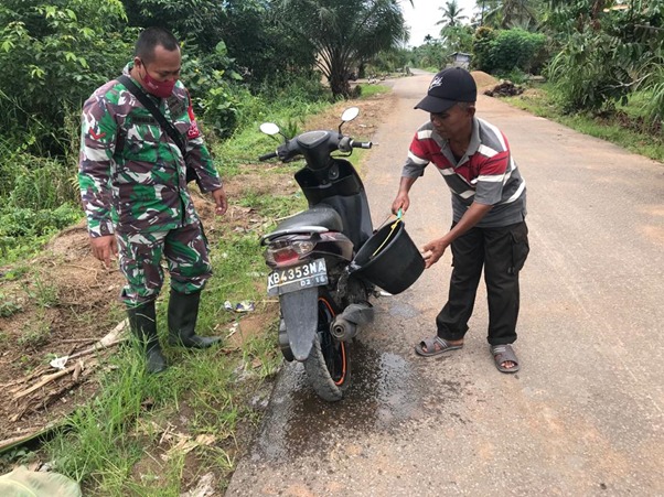 Setelah melewati jalan berlumpur di lokasi TMMD ke-111 Kodim 1207/Pontianak, terlihat bapak Girwoto seorang warga Desa Kuala Mandor B sedang membersihkan lumpur yang menempel di motornya. Anggota satgas TMMD yang melihat langsung menghampiri dan membantu membersihkan motor milik bapak Girwoto tersebut.