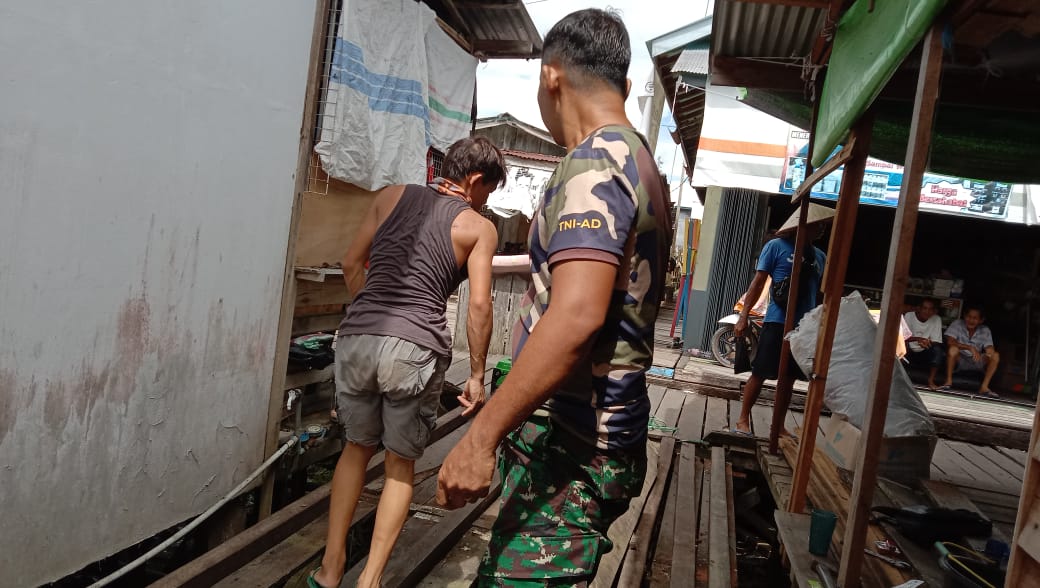Jongkong- Babinsa Koramil 1206-09/Jongkong Koptu Umar bersama masyarakat melaksanakan kegiatan perbaikan jembatan kayu yang sudah rusak di Desa Jongkong Kecamatan Jongkong, Kabupaten Kapuas Hulu, Rabu (09/06/21)