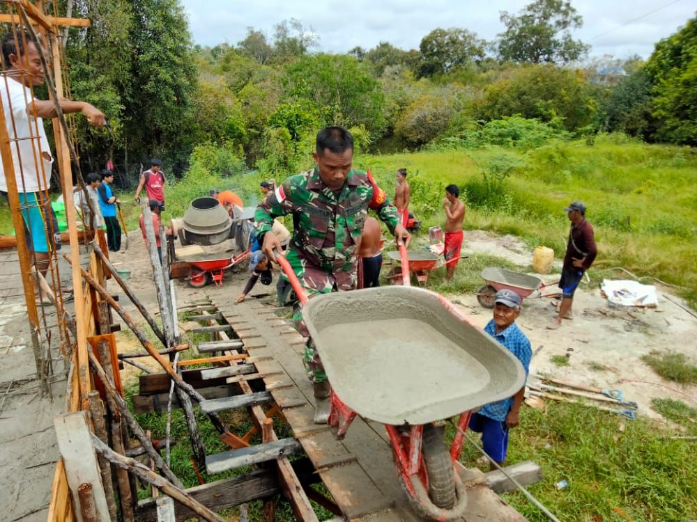 Tanjung Harapan- Babinsa 1206-15/Suhaid, Serda Abraham membantu masyarakat dalam membangun Masjid di Kampung Tanjung Harapan, Kecamatan Suhaid, Kabupaten Kapuas Hulu. Senin (14/06/21).