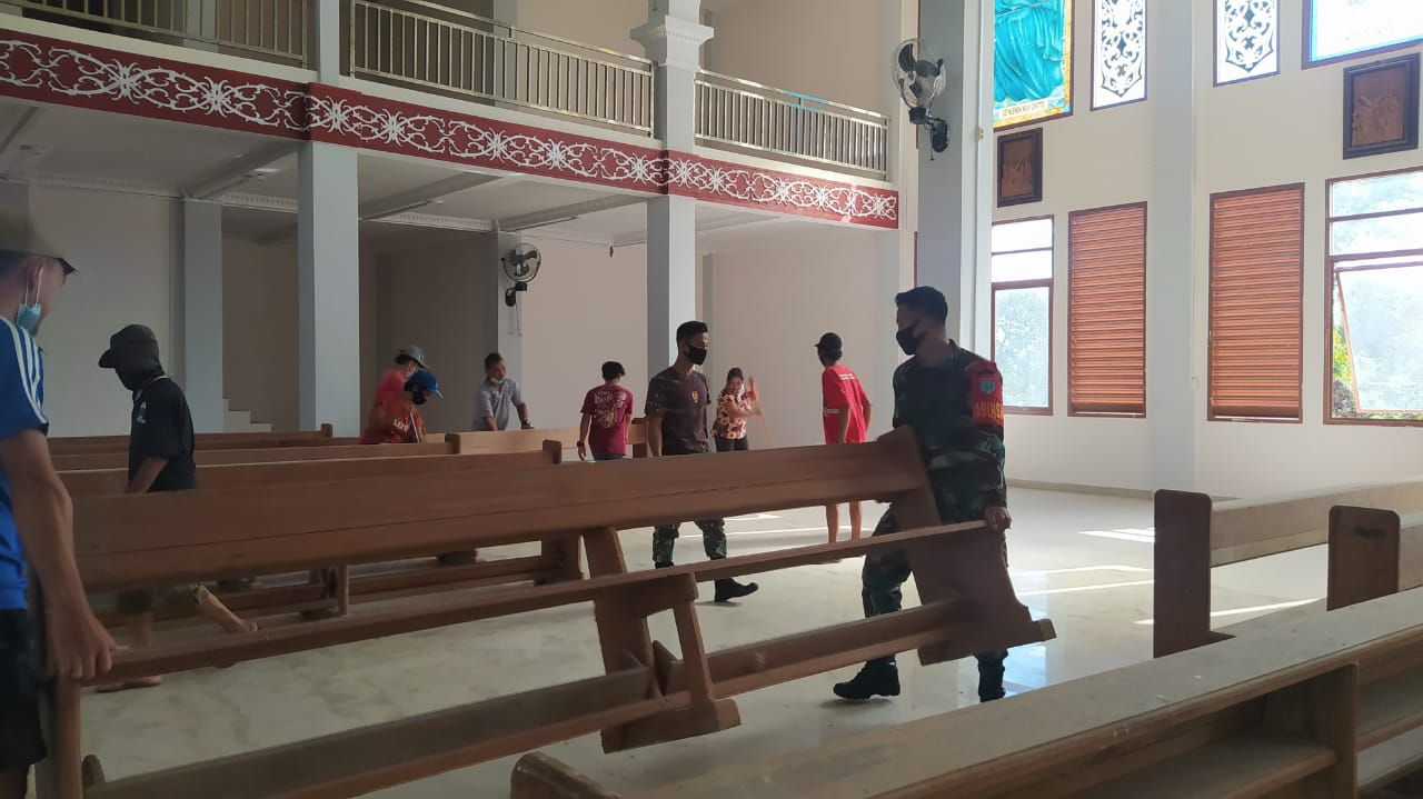 Seberuang – Demi menjaga Kebersihan dan keindahan lingkungan Gereja, Koramil 1206- 16/Seberuang Serda Yohanes, melaksanakan gotong royong bersama masyarakat membersihkan lingkungan Gereja sejiram, Kecamatan Seberuang, Kabupaten Kapuas Hulu, Minggu (30/05/21).