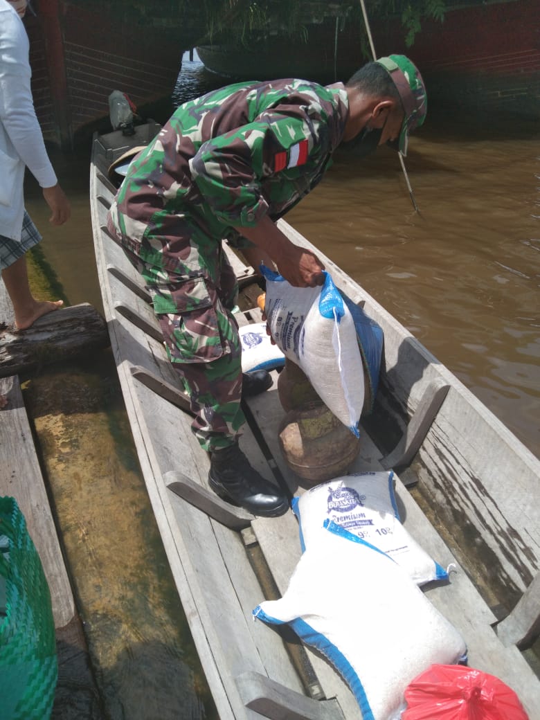 Babinsa Praka Junaidin membantu masyarakat membawa angkutan barang belanjaan di Penyeberangan yang menghubungkan desa Embaloh Kiri dan Embaloh Kanan yang berada diseberang sungai Kapuas, Kamis (01/06/2021).