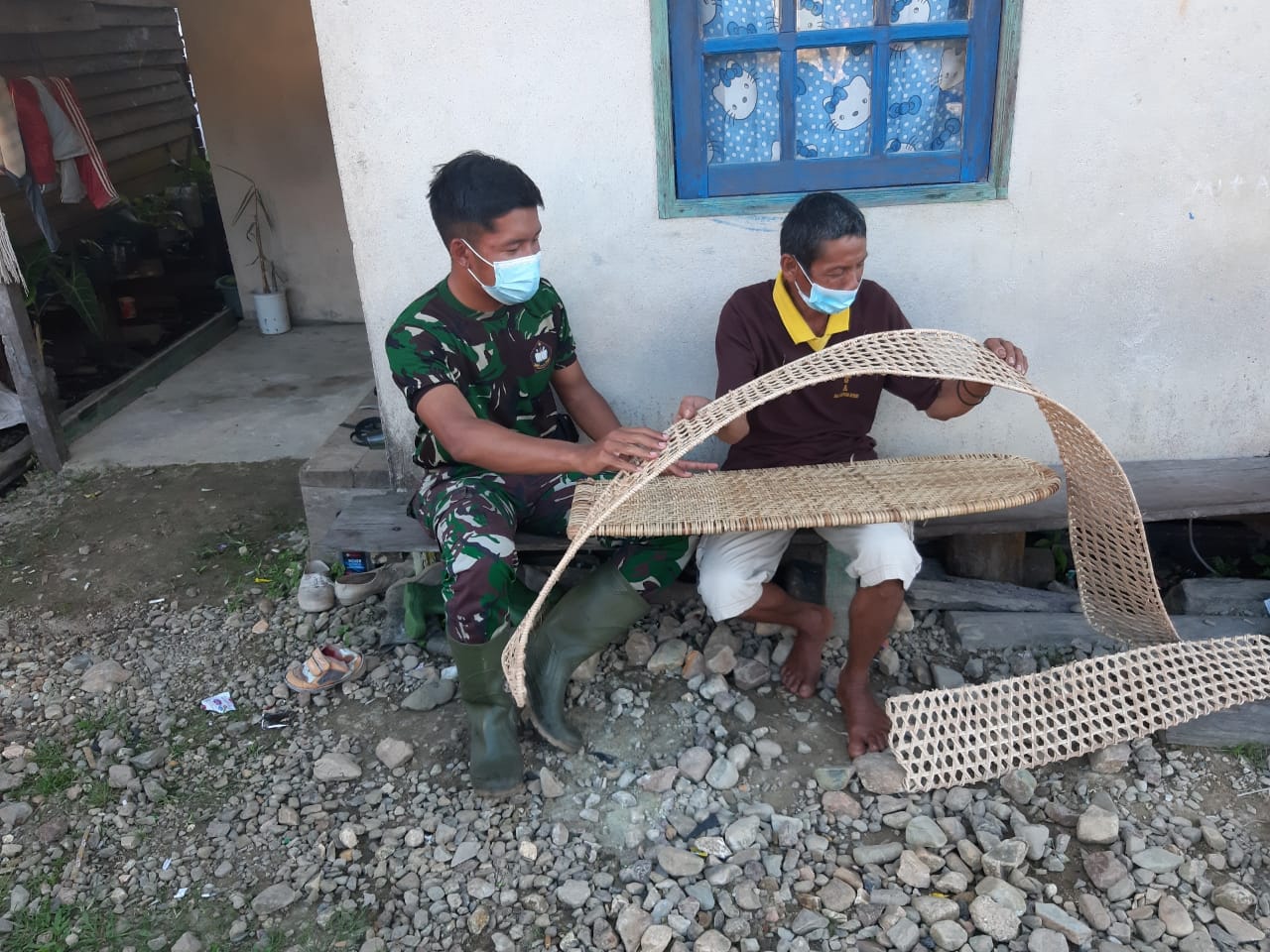 Pengkadan – Babinsa lakukan komsos ke warga di Dusun Suka Ramai, Desa Hulu Pengkadan, Kecamatan Pengkadan, Kabupaten Kapuas Hulu sambi melihat kerajinan dari bahan rotan. Sabtu (05/06/21)