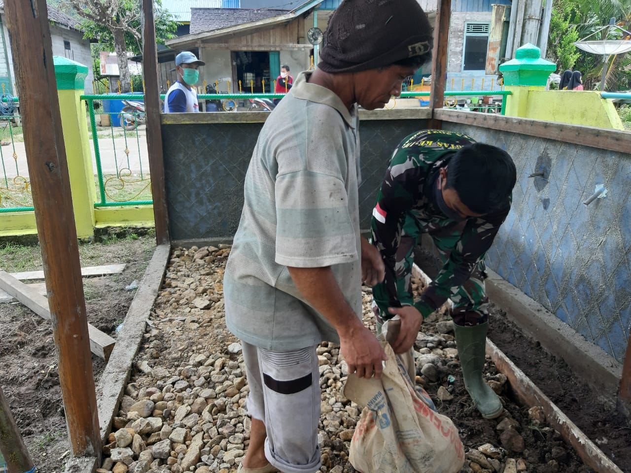 Di tunjukan denga sikap seorang prajurit yang menyatu jiwanya dengan rakyat, Serda Andre Ginola tak ragu membantu masyarakat melakukan pengecoran di mushola Dusun Suka Ramay.
