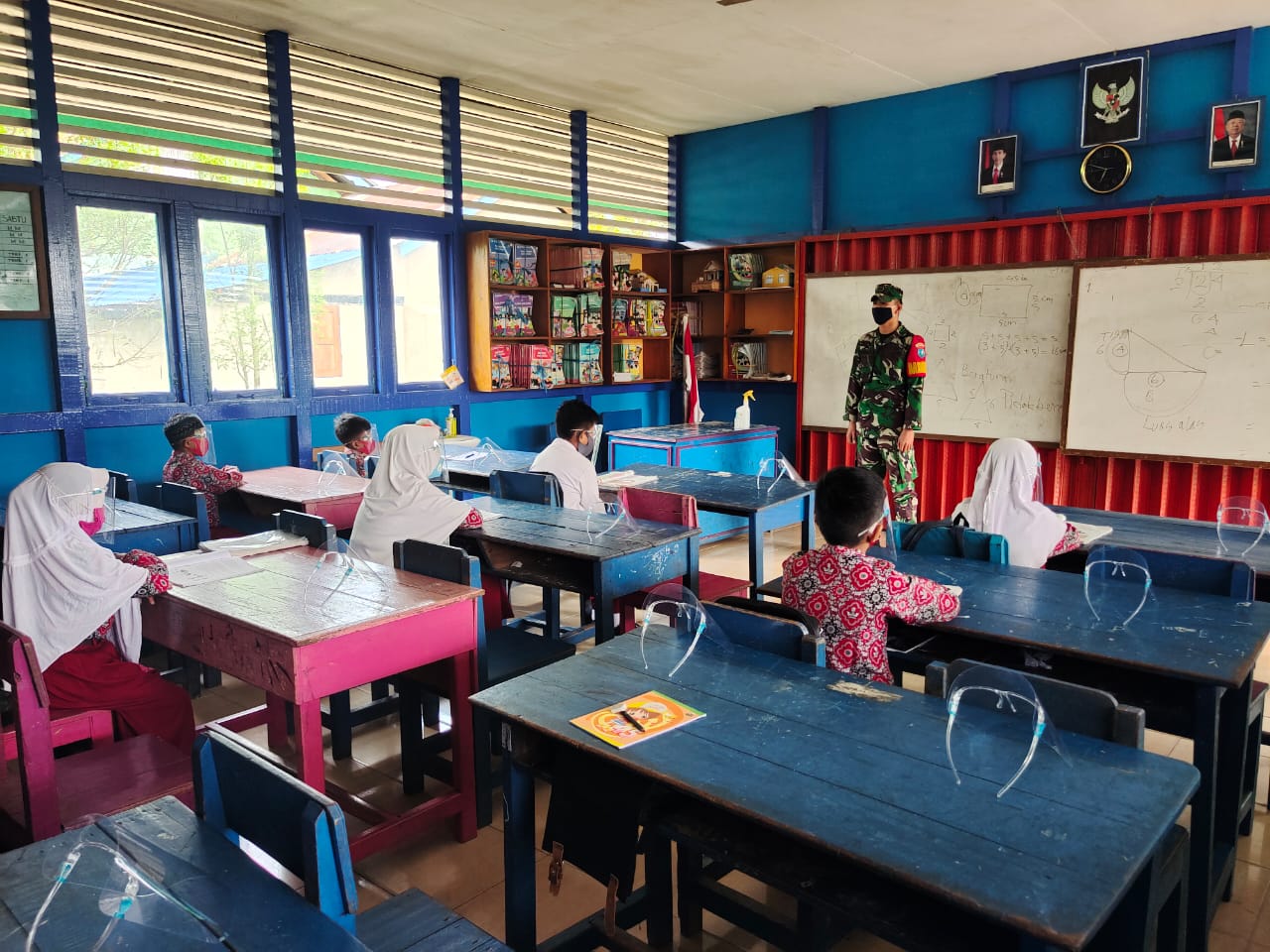 Sementara Kepala Sekolah menyampaikan ucapan terima kasihnya kepada TNI, khususnya anggota Koramil 1206-06/ Putussibau Utara Firdaus Dakun yang selalu peduli untuk selalu menerapkan protokol kesehatan agar terhindar dari Covid 19.