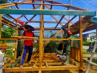 Pengkadan – Terlihat Babinsa 1206-09/Jongkong Pengkadan Sertu Sumadi, Praka M.Zulfiqor bantu pengerjaan pembuatan Poskampling di Desa Mawan Kecamatan Pengkadan. Sabtu, (29/05/202)