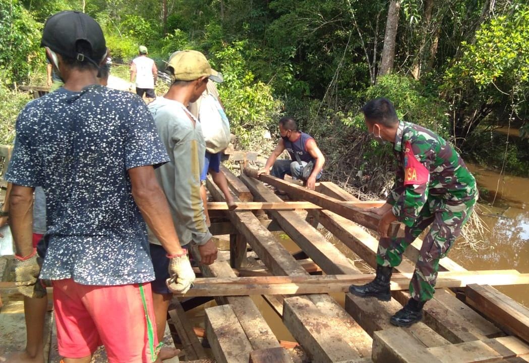 Semitau – Upaya membangun kerjasama antara masyarakat dengan TNI telah dilaksanakan oleh Babinsa Koramil 1206 – 02/Semitau, dengan ikut turun tangan langsung membantu warga membangun jembatan yang sudah lama rusak akibat diterjang banjir. Rabu (09/06/2021).
