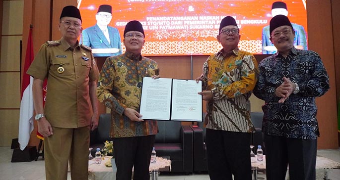 Salah satunya dengan dihibahkannya 14 aset Gedung eks STQ oleh Pemprov Bengkulu kepada UINFAS Bengkulu yang ditandai dengan Penandatanganan Naskah Hibah Gedung eks STQ Bengkulu sekaligus fasilitas pendukung lainnya, di Gedung Jama’an Nur UINFAS Bengkulu, Senin (18/12).