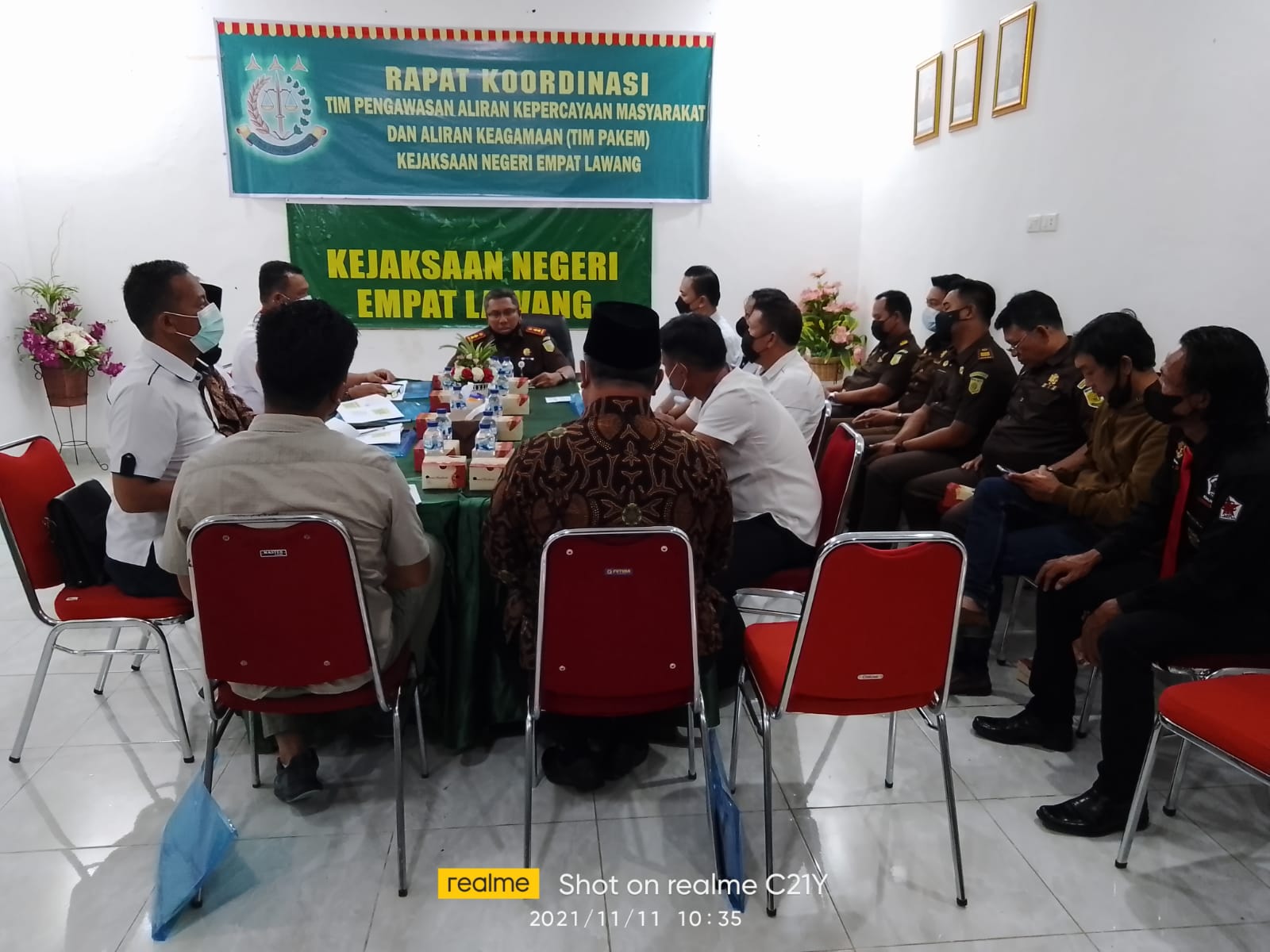 Rapat koordinasi ini dengan agenda rapat yaitu pembahasan mengenai aliran kepercayaan serta kegiatan keagamaan. Pada kegiatan tersebut dipimpin langsung oleh Kepala Kejaksaan Negeri Kabupaten Empat Lawang Sigit Prabowo, didampingi oleh Kepala Seksi Intelijen Kejaksaan Negeri Empat Lawang Eko Setya Negara dan tim lainnya, Anggota Polres Empat Lawang, Bimas Pembinaan Agama Islam Kantor Kementerian Agama, Kepala dan Kabid Kemasyarakatan Badan Kesatuan Bangsa Dan Politik serta tamu undangan lainnya.