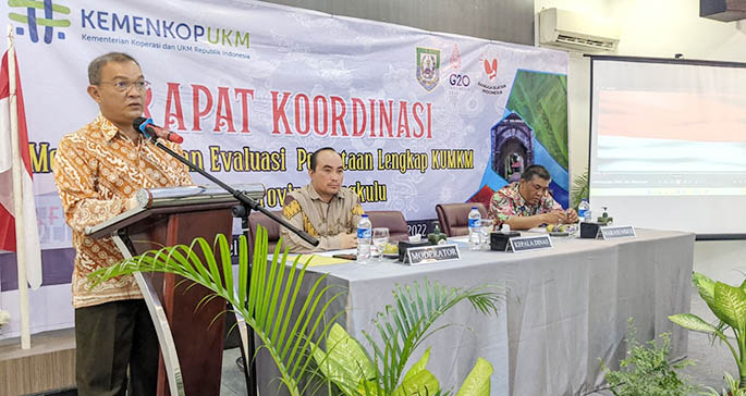 Berandang.com- Kepala Dinas Koperasi dan UKM Provinsi Bengkulu Erdiwan, SH M.Si membuka rapat koordinasi (Rakor) Monitoring dan Evaluasi Pendataan Lengkap KUMKM se-Provinsi Bengkulu. Kamis, (17/11/2022).