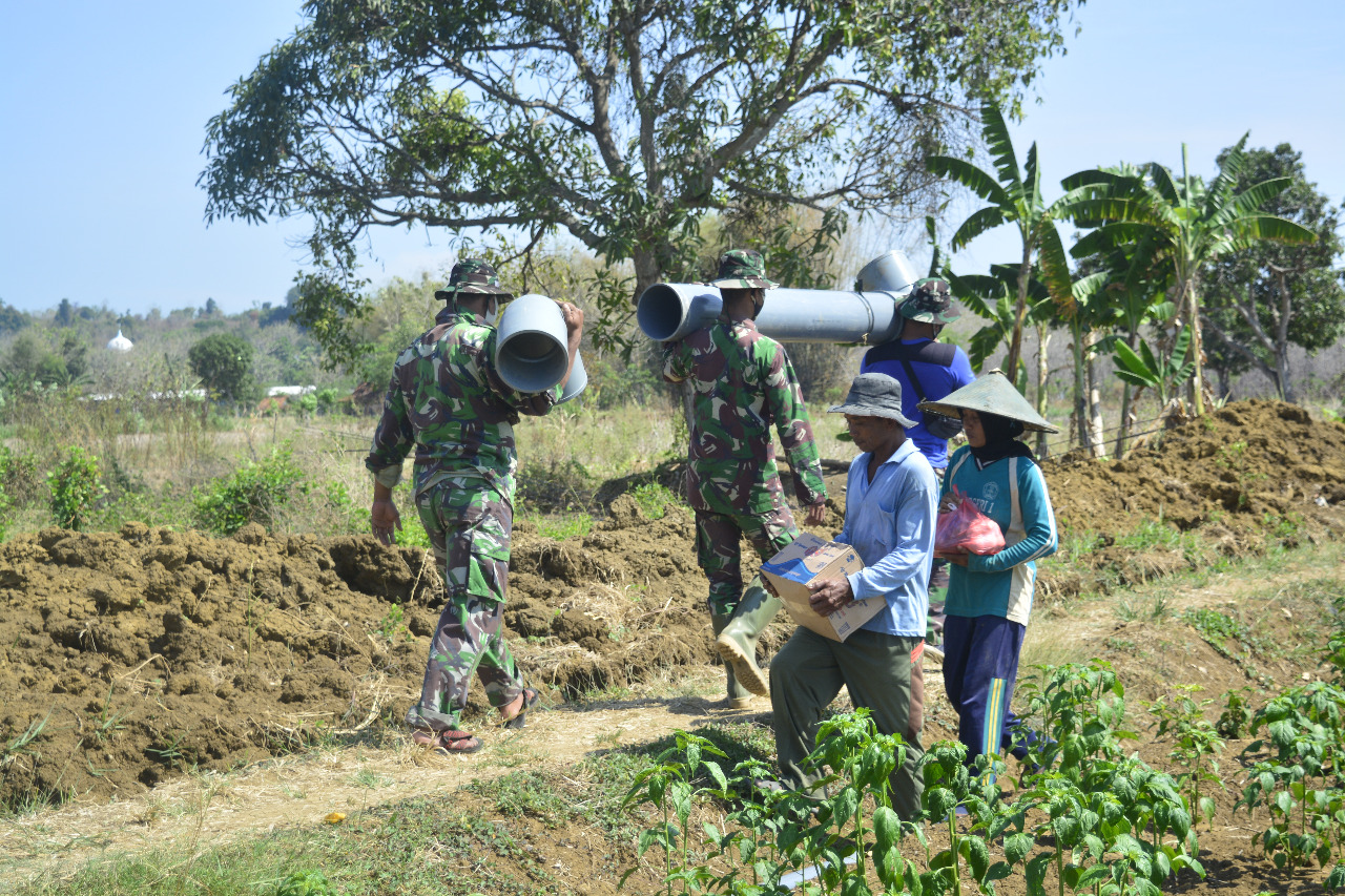 Seperti yang dilakukan oleh Ibu Usrotul Ulah dan sejumlah ibu-ibu lainnya di Desa Tebluru. Pagi hari memasak setelah memasuki jam istirahat, mereka berbondong-bondong ke lokasi pekerjaan TMMD untuk mengantarkan logistik makan dan minum bagi warga dan anggota Satgas yang tengah bekerja di pengerukan pipa saluran air.