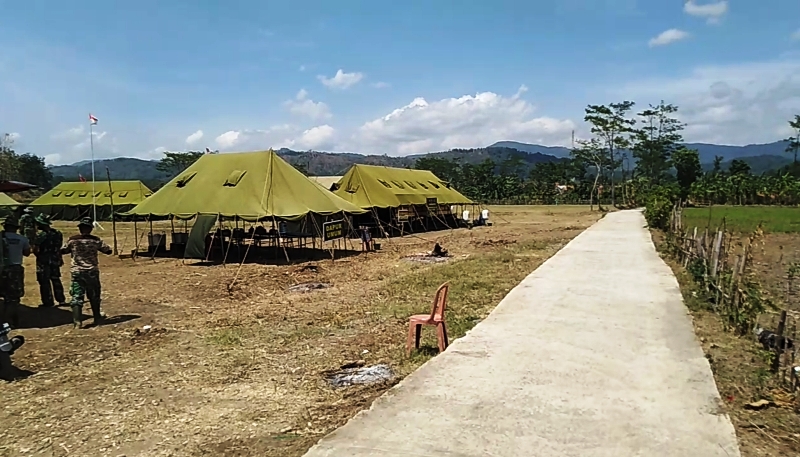 Situasi tersebut tercipta lantaran 5 tenda pleton yang terpasang di lapangan, dimana 4 tenda digunakan untuk tempat tinggal para anggota Satgas TMMD, dan satu tenda sebagai dapur lapangan dan Poskotis TMMD.