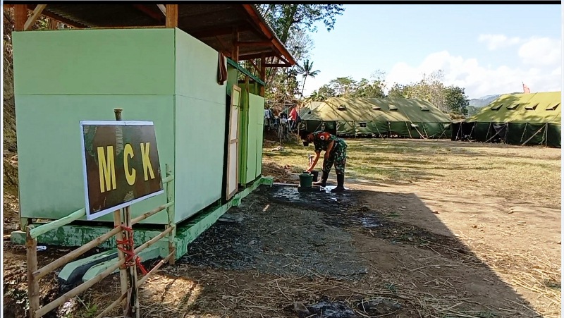 Brebes – Pemenuhan air bagi MCK Satgas TMMD Reguler 109 Kodim 0713 Brebes yang dipusatkan tinggal di tenda pleton di Lapangan Sepakbola Desa Kalinusu, Kecamatan Bumiayu, Kabupaten Brebes, Jawa Tengah, adalah berasal dari rumah warga terdekat di Dusun Karanganyar RT. 02 RW. 01, Rokhim (40), yang berasal dari Mata Air Beji, yaitu mata air yang tak pernah kering, di Dusun Beji, Kalinusu.